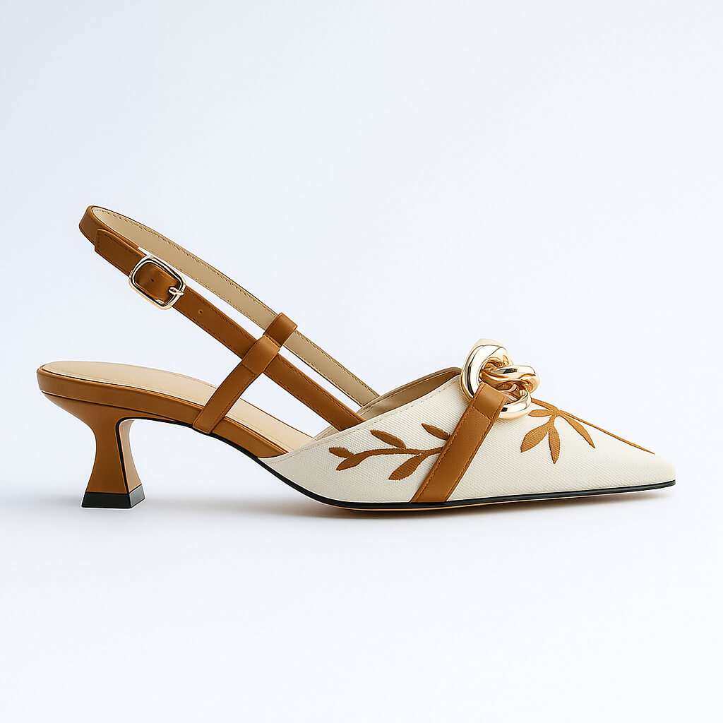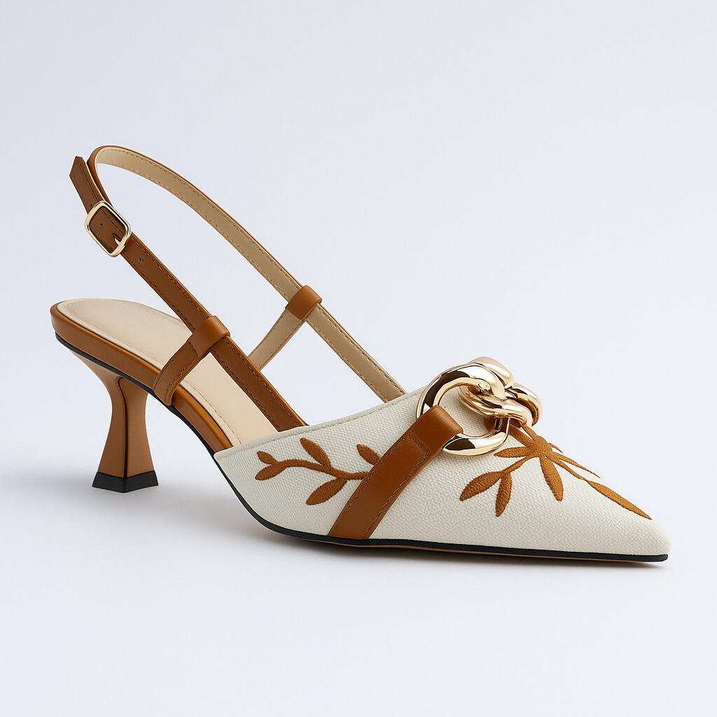 Embrace the beauty of craftsmanship with Amber Vine Slingbacks, a luxurious blend of tradition and contemporary design. These heels feature delicate vine embroidery across an ivory base, paired with tan straps and gold hardware for a refined, feminine look.