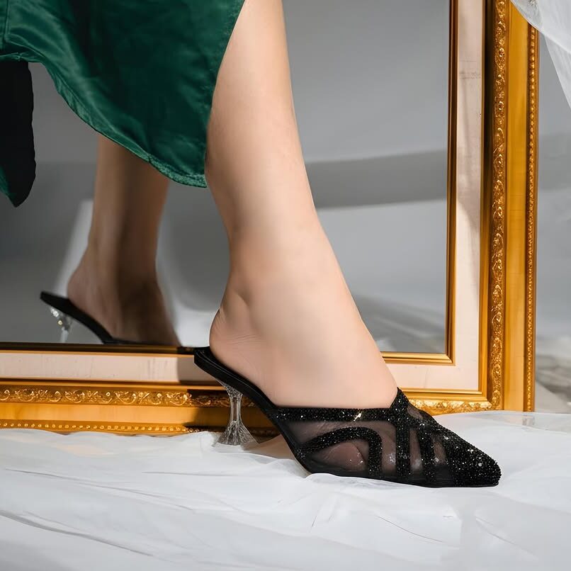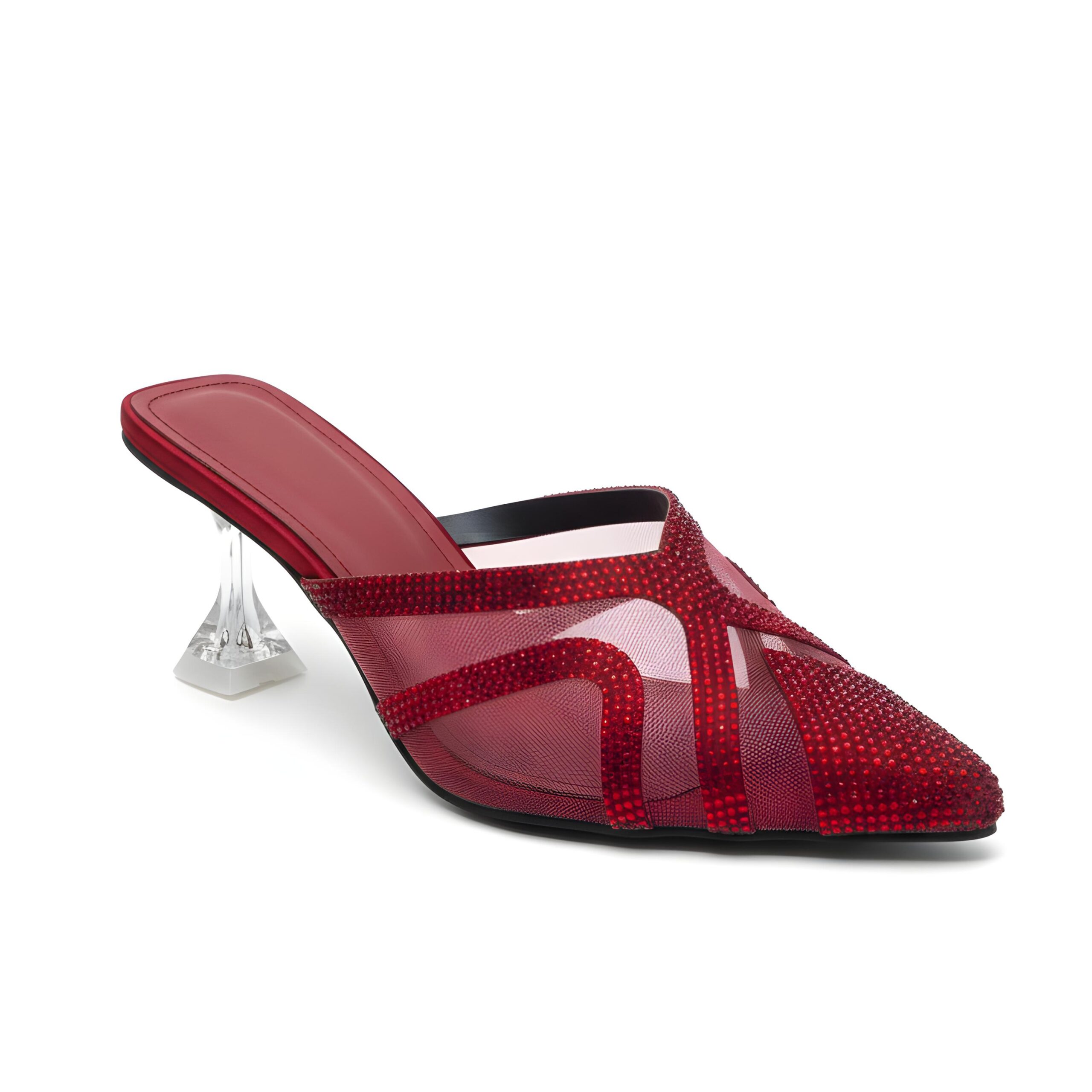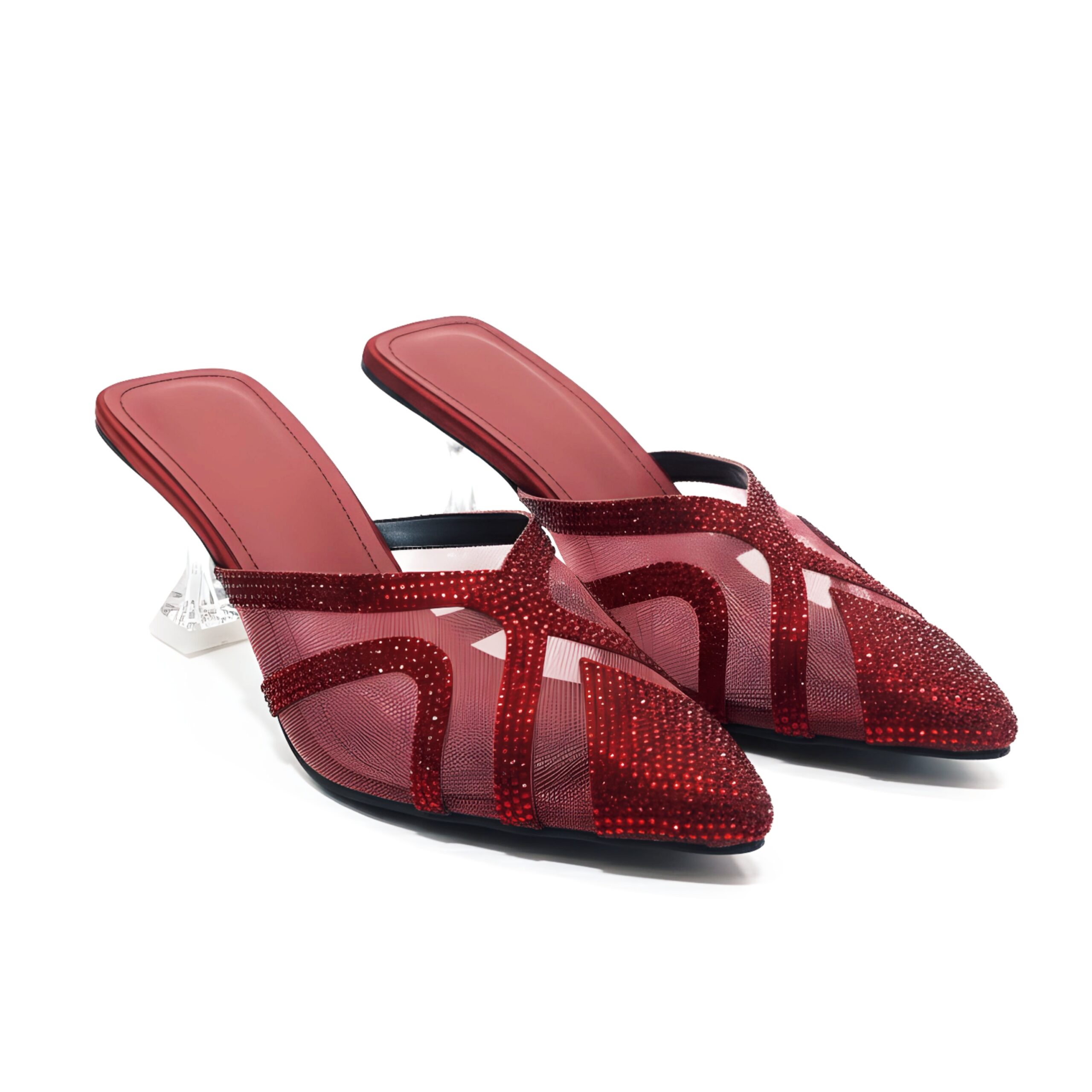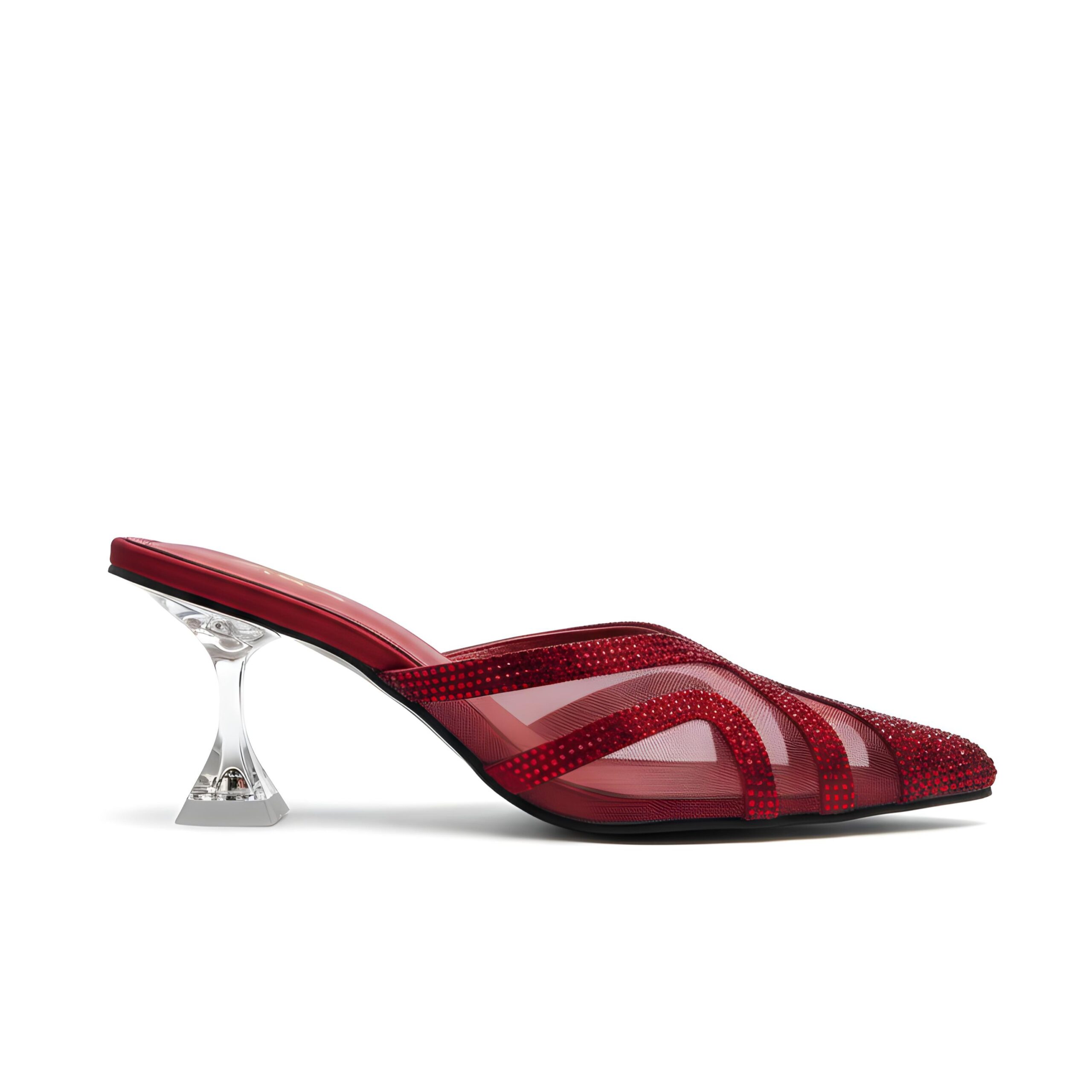 Sheer Mesh Heels embody bold sophistication with a modern edge. Crafted in a striking crimson tone, these heels feature a sleek pointed toe, rhinestone-studded straps, and a sculpted transparent heel that adds elegance with a touch of drama. Designed for evenings that call for statement style, they perfectly balance glamour and comfort.